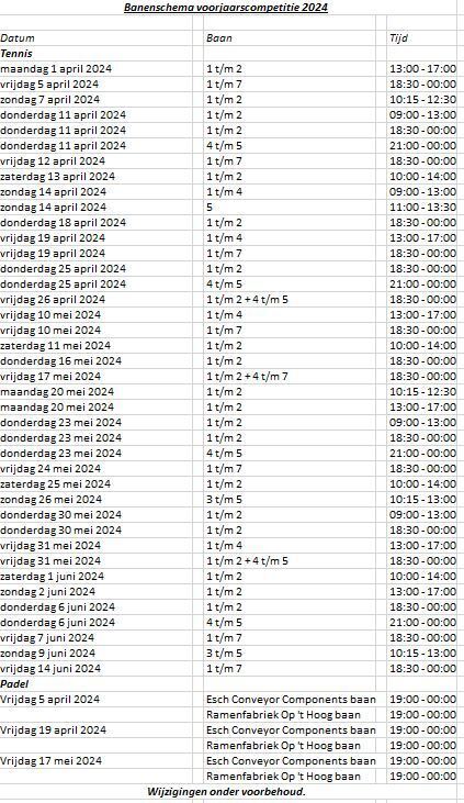 Voor de voorjaarscompetitie zijn banen gereserveerd volgens onderstaand schema.